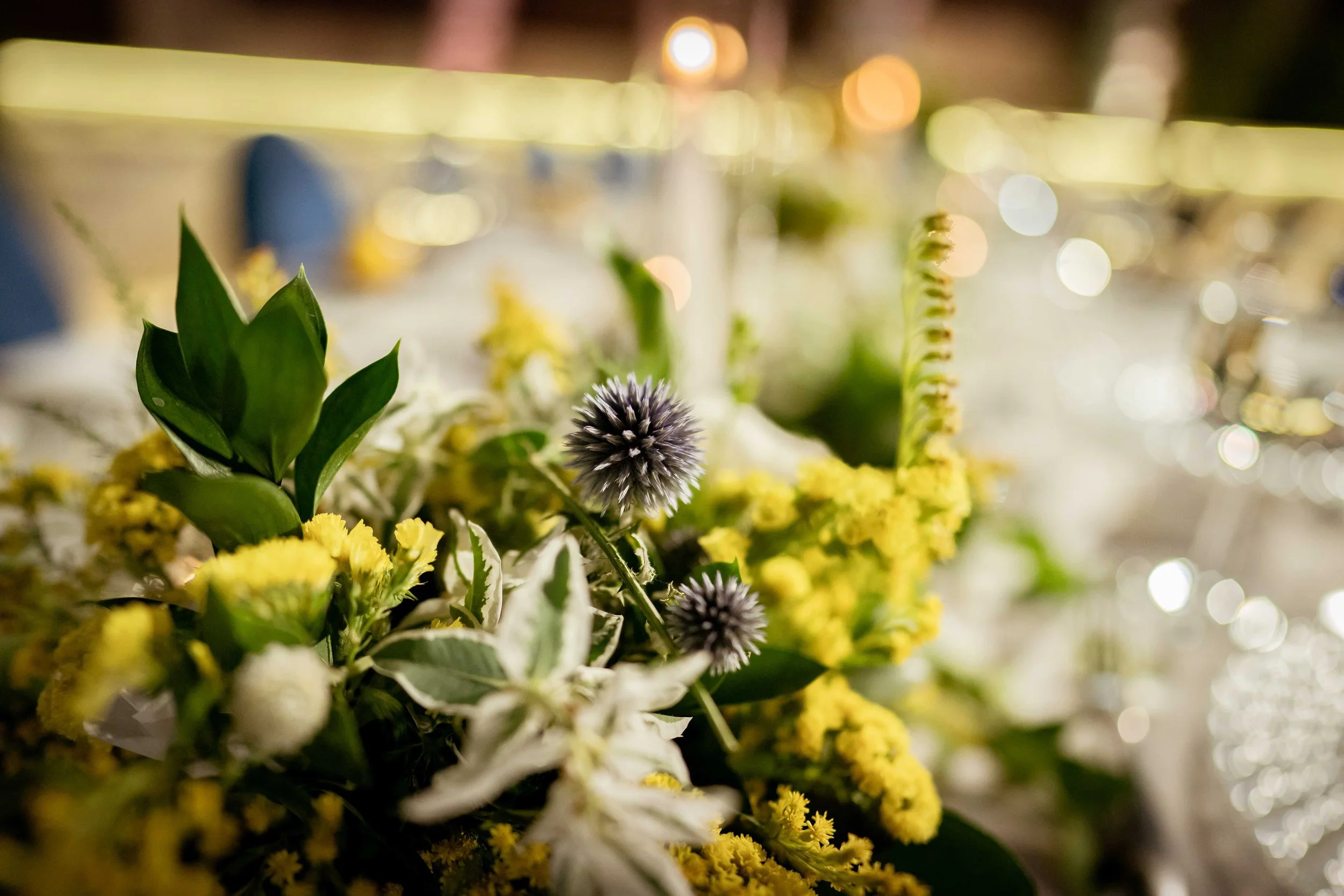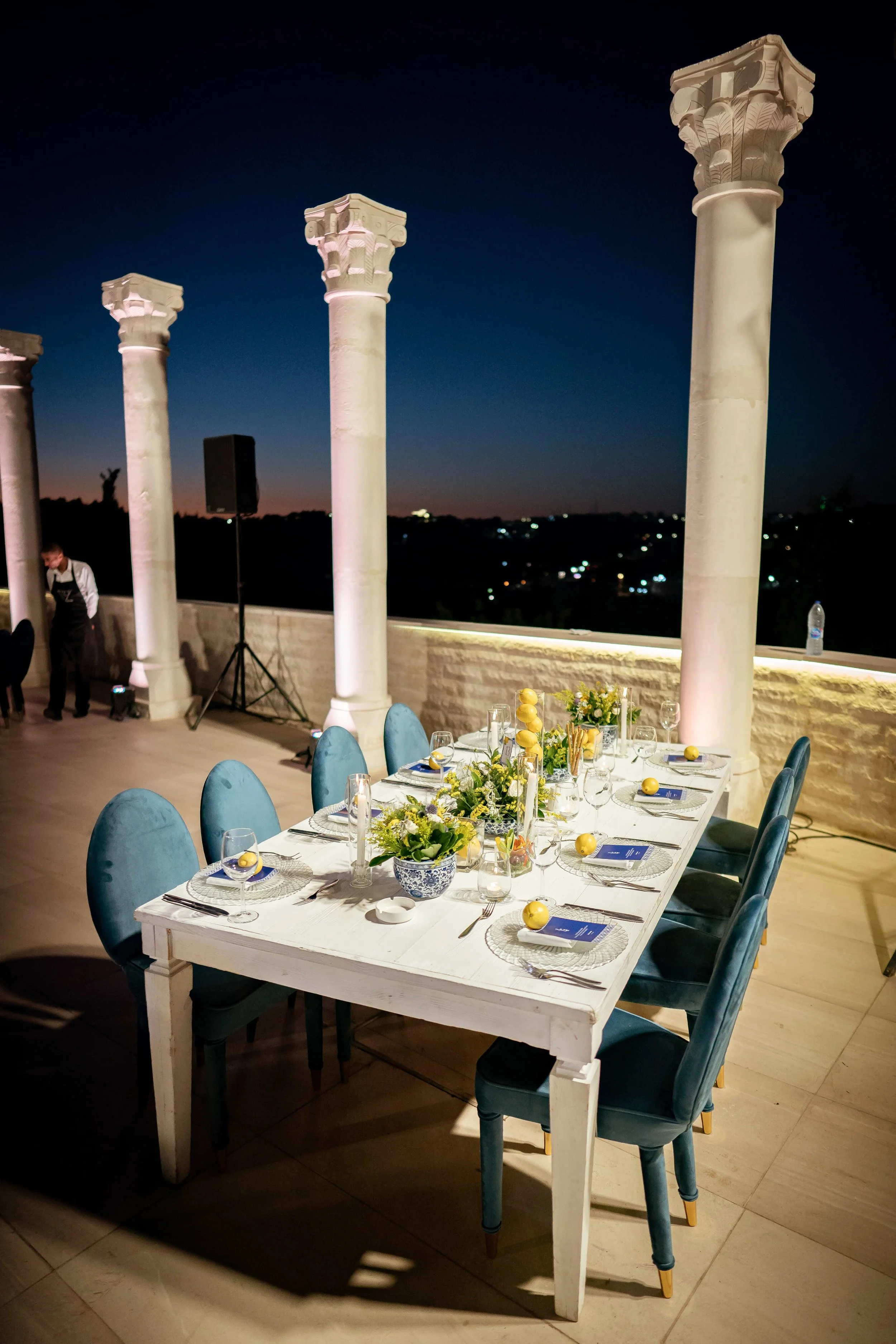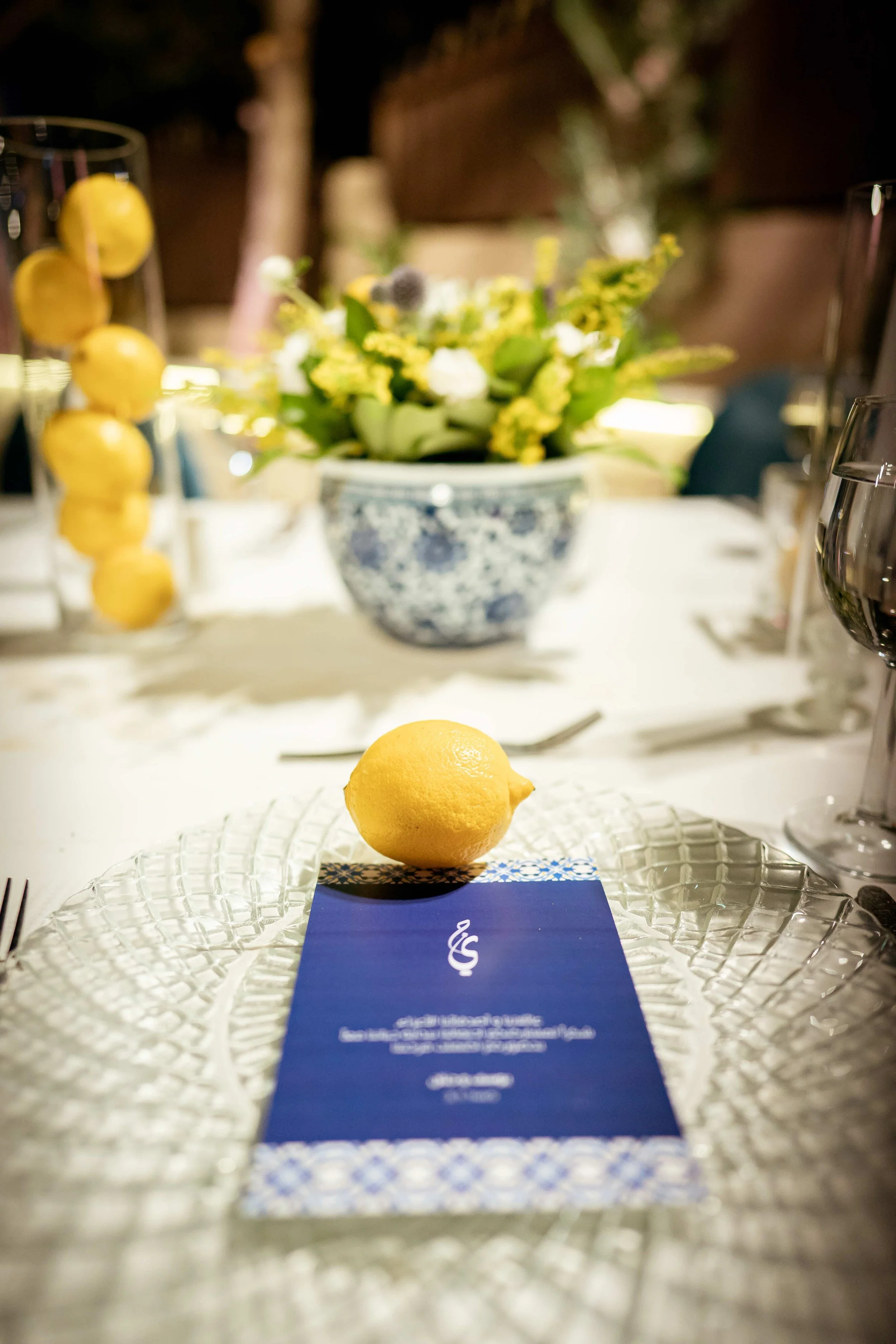 Accented by rich blues and sunny yellows that evoke the region's iconic lemons and landscape. Centerpieces feature lush greenery and bright flowers, such as lemons and hand picked wildflowers, which are housed in classic blue and white ceramic vases, invoking the timeless beauty of Mediterranean pottery.