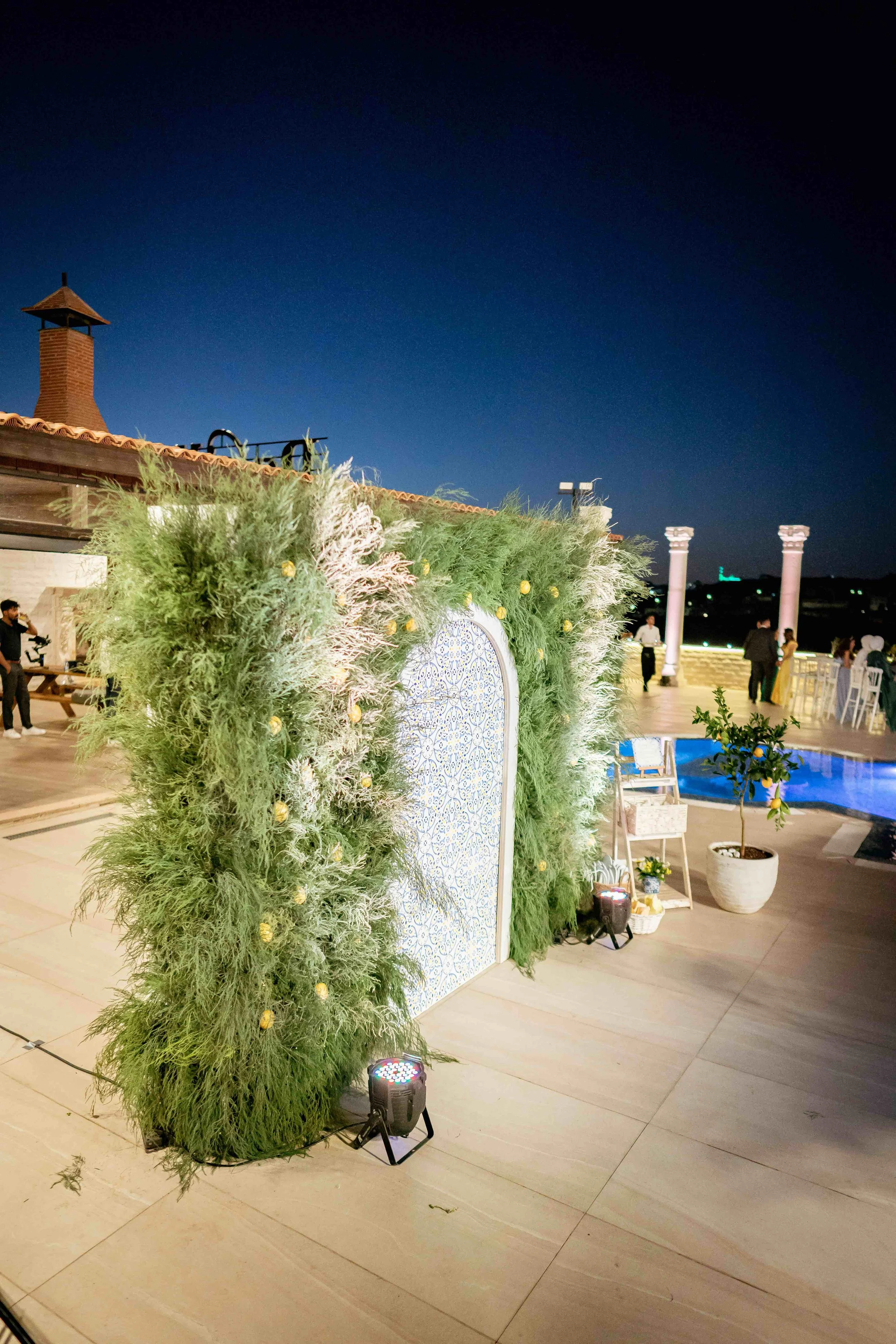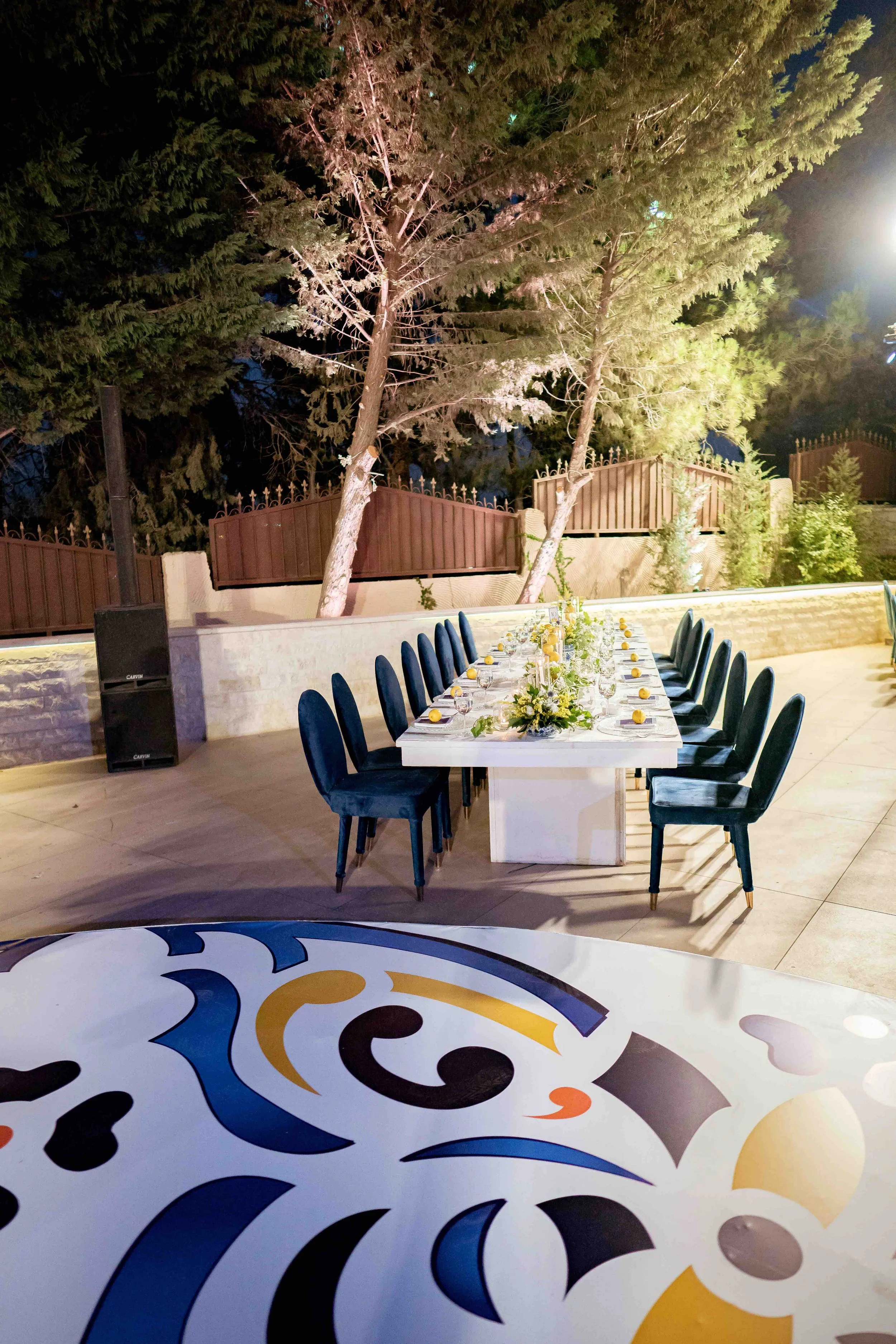 Every detail aims to create the perfect ambiance of beauty and festivity while reflecting a personalized experience. starting with transforming the stairs with a Mediterranean colorful tile to a customized pattern for the dance floor in addition to the special design of the Photo backdrop, every element whisper tales of grandeur and celebration.